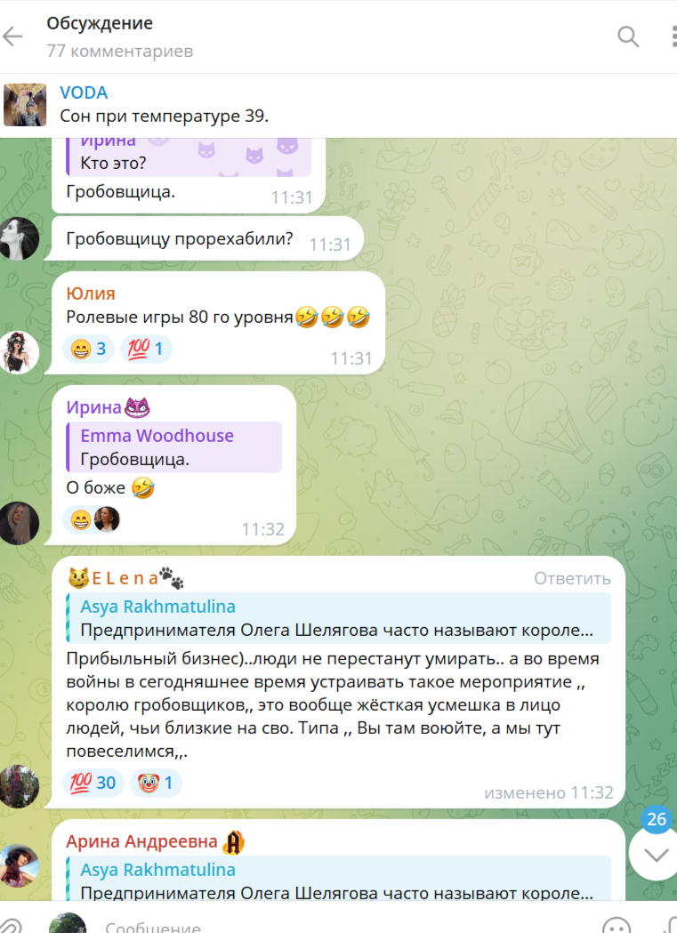 "Прибыльный бизнес... Люди не перестанут умирать… А во время войны в сегодняшнее время устраивать такое мероприятие королю гробовщиков - это вообще жёсткая усмешка в лицо людей, чьи близкие на СВО. Типа, вы там воюйте, а мы тут повеселимся…"