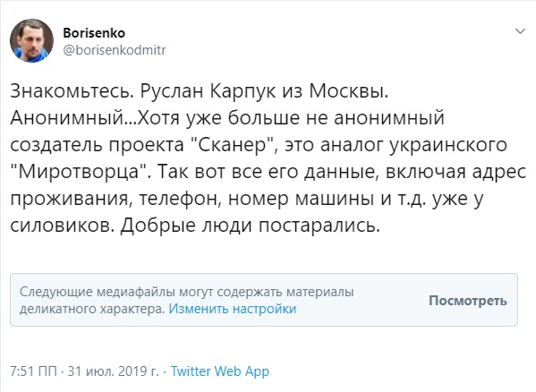 "Знакомьтесь. Руслан Карпук из Москвы. Анонимный... Хотя уже больше неанонимный создатель проекта "Сканер", это аналог украинского "Миротворца". Так вот, все его данные, включая адрес проживания, телефон, номер машины и т.д. уже у силовиков. Добрые люди постарались", - написал в своем аккаунте журналист Дмитрий Борисенко.