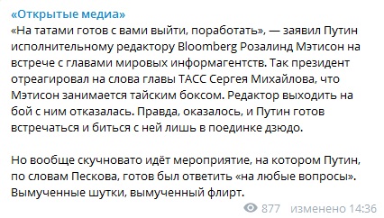 Они сообщают, что Путин предложил Розалинд Мэтисон, исполнительному редактору Bloomberg, выйти на татами после её вопроса, в котором она упомянула, что занимается тайским боксом. Добавляется, что Мэтисон от поединка отказалась, и Путин в итоге тоже. Если не знать контекста беседы, можно предположить, что президент России собрался биться с женщиной после неудобного вопроса.