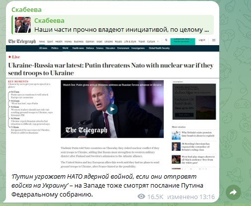 Тем временем на Западе буквально прильнули к экранам и внимательно слушают речь Владимира Путина. Его ответ уже стал номером один в СМИ. Традиционно западные пропагандисты уводят своих зрителей и читателей от сути и от самого важного, что сказано русским лидером. Вместо того чтобы особо подчеркнуть призывы Владимира Путина не развязывать ядерную войну и не заниматься провокациями, на Западе, по своему обыкновению, громко вопят об угрозе нападения России.