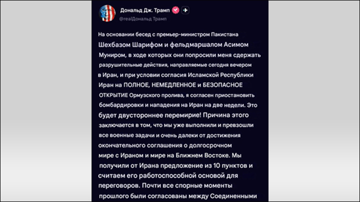 В привычной для себя манере он заявил о достижении всех военных целей кампании и подготовке окончательного мирного соглашения. И что ещё более важно, американский президент сообщил, что получил мирный план Ирана из 10 пунктов и считает его работоспособным.