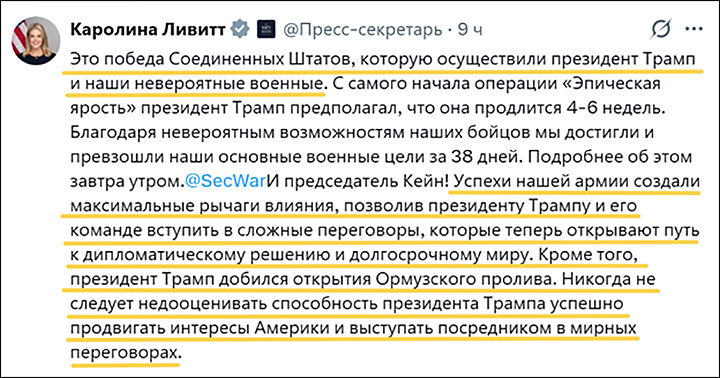В результате сейчас иранцы празднуют на улицах своих городов победу. Американцы... тоже заявили о своей победе. Вот что написала пресс‑секретарь Белого дома Кэролайн Ливитт: