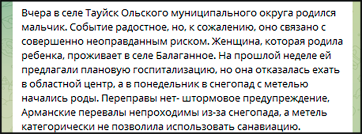 Беременные из отдалённых сёл в Магаданской области рискуют не доехать до роддома вовремя//Скриншот поста из ТГ-канала Александра Витько