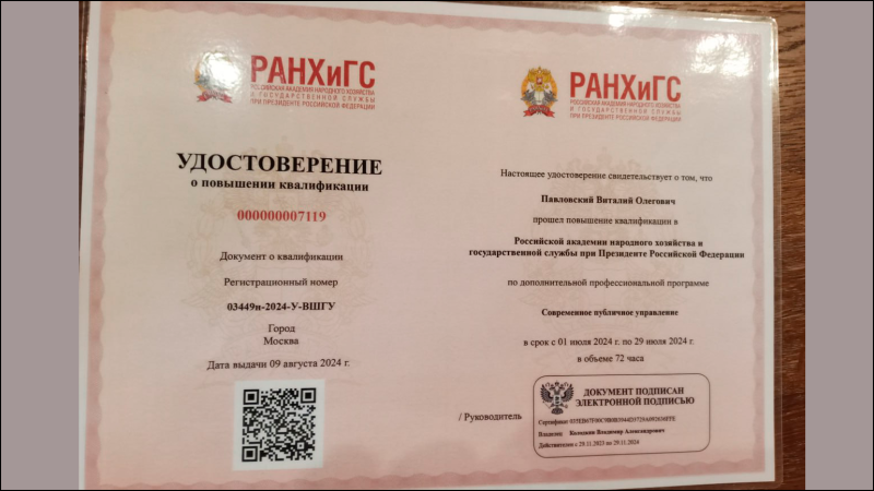 ФОТО: Удостоверение об окончании дистанционного обучения по специальности "публичное управление". Фото автора