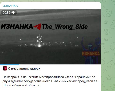 К слову, если итоги сегодняшнего массированного налёта еще неизвестны, то вчерашние результаты уже начинают радовать. Так, по данным "ИЗНАНКИ", стали доступны кадры объективного контроля нанесения массированного удара "Геранями" по двум зданиям Государственного НИИ химических продуктов в г. Шостке Сумской области.