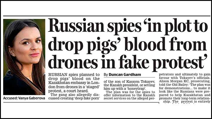 Британские следователи раскрыли хитроумный план русских шпионов: с помощью дрона и прикреплённой ёмкости со свиной кровью планировалась атака на посольство Казахстана в столице Великобритании. Вопрос, с какой целью можно совершить столь экзотическое деяние, никого особо не заботит. На него ответил прокурор в ходе судебного заседания по уголовному делу, главными фигурантами стали пятеро задержанных спецслужбами "агентов" Кремля. В суде всплыла масса нюансов работы "банды шпионов", которые досужие журналисты тут же слили на страницы своих изданий. Заголовки один другого круче: "Русские шпионы готовили "медовые" ловушки"; "Русский агент вынашивал план по внедрению настоящей "секси битч" в постель известного журналиста"; "Русские шпионы планировали сбросить дрон со свиной кровью".