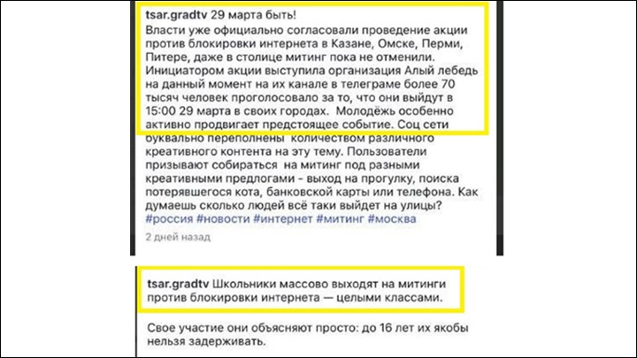 Несмотря на то что срыв запланированных на 29 марта массовых протестов стал очевиден несколькими днями ранее, фейковый аккаунт продолжал уверять пользователей, что митинги одобрены и состоятся. А непосредственно в "день Х" распространял фальшивые видео выхода на протесты "школьников всем классом".
