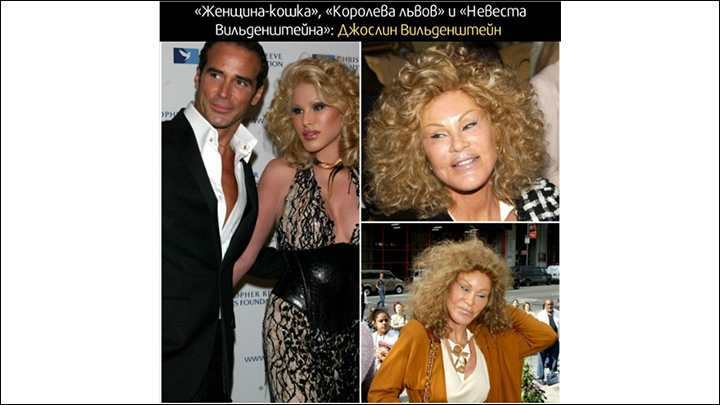 Один из самых ярких случаев – Джоселин Вильденштейн. Светскую львицу можно назвать ходячим пособием для пластического хирурга: подтяжка бровей и век, "кошачий" разрез глаз, импланты в щеки и подбородок, изменение формы губ, подтяжка средней зоны лица. Всё это ради того, чтобы удержать мужа-олигарха.