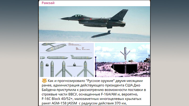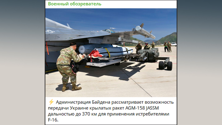 F-16 рассматривается как пусковая платформа, но без AGM-158 JASSM ему нечем бить на большую дистанцию по земле. Скриншот с ТГ-канала В. Шурыгина