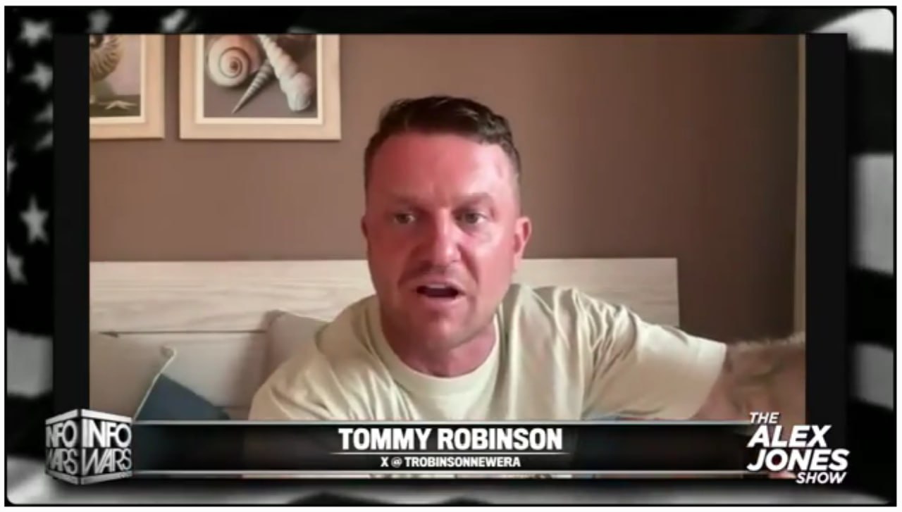 Он выступил в популярнейшем в США подкасте Алекса Джонса InfoWars, заявив, что "правительство Великобритании платит провокаторам, чтобы те разжигали беспорядки по всей стране". Робинсон был представлен в подкасте как лидер, который "подрывает усилия правительства Великобритании по разжиганию гражданской войны между гражданами, которые обеспокоены их безопасностью и суверенитетом, а также тем, что государство поддерживает мусульманских захватчиков".