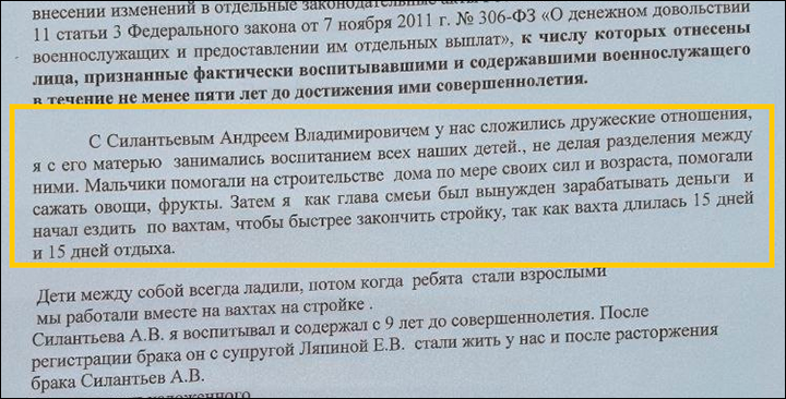 Нет доказательств, что основное обеспечение семьи было на Прокофьеве. Судя по справке из ПФР, доходы у него были небольшие. Семья была небогатая, он часто уезжал по командировкам, его месяц могло не быть дома. В это время дети были на Тамаре. Прокофьев не являлся ни мужем матери погибшего, ни его опекуном – никем. В судебном заседании выяснилось, что с 16 лет Андрей работал и не проживал в этом доме, потому что Прокофьев поднимал на него руку, выгонял из дома. Когда Андрей приезжал в родной город, он жил на соседнем участке в недостроенном строении. Это подтвердили соседи и друзья, которые знали Андрея с детства,
