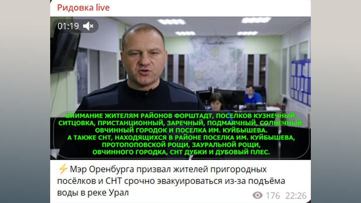 Власти сообщают, что вода продолжает прибывать. Это надолго. Скрин тг-канала Ридовка live.