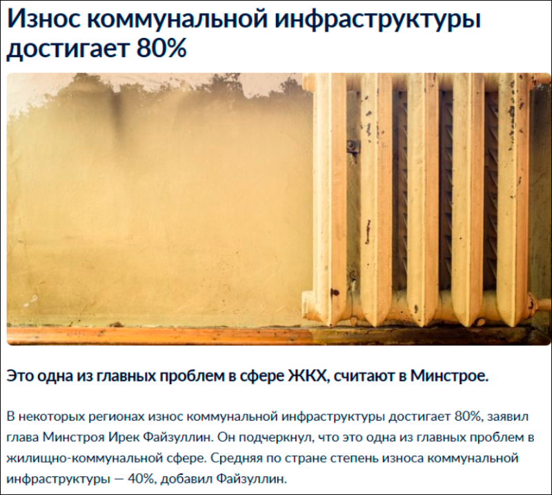 Сейчас они просто присваивают себе основную долю средств, финансируя ЖКХ по остаточному принципу. По данным Росстата и Минстроя, средний износ сетей коммунальной инфраструктуры в России превышает 40-60%, а в ряде регионов достигает 80%.
