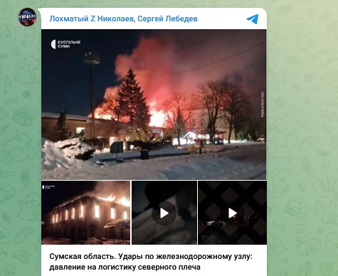 В Сумской области в ночь на 2 февраля дроны "Герань-2" и "Герань-3" нанесли серию ударов по объектам железнодорожной инфраструктуры в Сумах. Поражены локомотивы, а также ремонтная мастерская, обеспечивающая восстановление и обслуживание подвижного состава. По данным Лебедева, удар именно по локомотивам и ремонтной базе указывает на смену акцента: