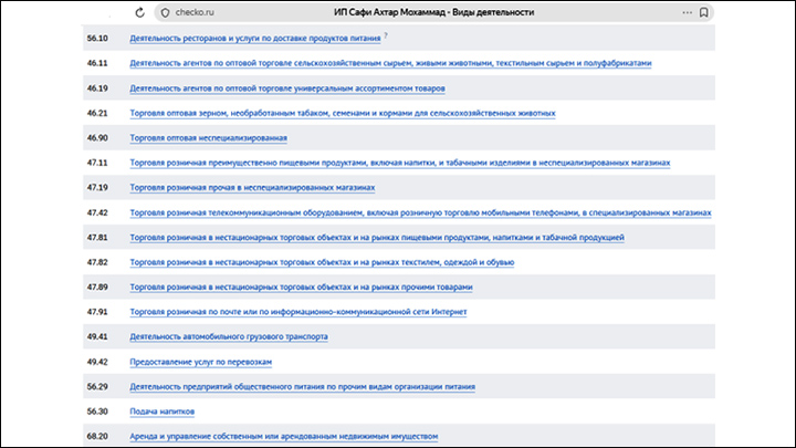 Кроме руководителя Коженова у Центра помощи мигрантам есть ещё и исполнительный директор Ахтар Сафи. Вот только предприниматель тёзка Ахтара Сафи прекратил в России свою деятельность, тоже никак не связанную с юридическими консультациями. Странно, что из 17 полученных ОКВЭД ни одно дело на русской земле не раскрутилось.