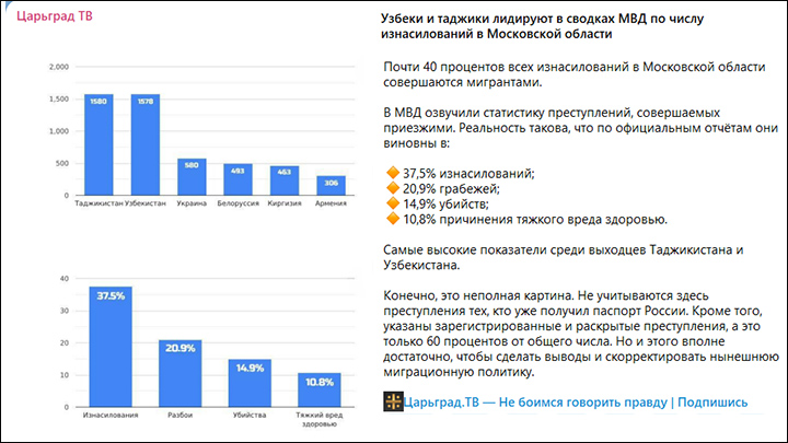 Наглядно о мигрантской преступности. Скрин поста ТГ-канала "Царьград ТВ"