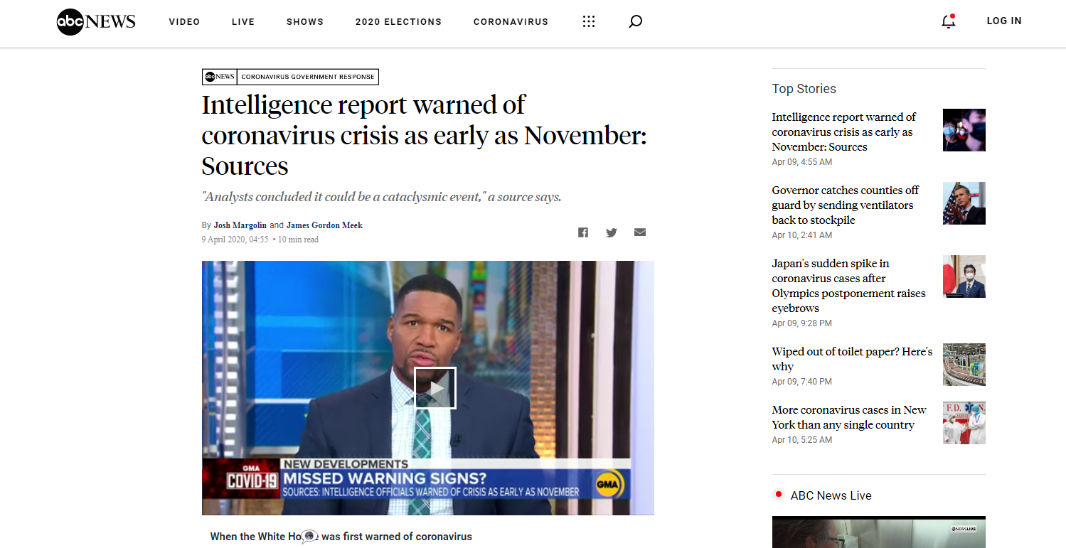 Отмечается, что опасность новой инфекции была подробно изложена в отчёте разведки, подготовленном военным Национальным центром медицинской разведки (NCMI). Отчёт был результатом анализа перехвата информации в сочетании со спутниковыми снимками. Первоначально считалось, что коронавирус несёт угрозу не всему миру или США, а американскому контингенту в Азии, однако потом угроза выросла.