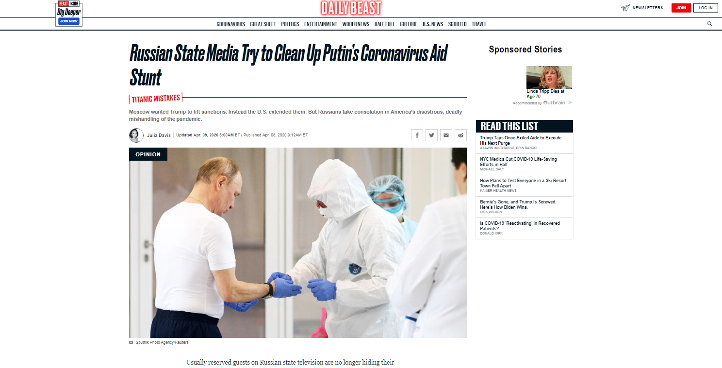 "Обычно гости на российском государственном телевидении не скрывают своего раздражения и, скорее всего, своего страха, поскольку их страна на пороге пика эпидемии и отчаяния из-за COVID-19. Но на что теперь направлен их гнев? На поставку медицинского груза в США, за которой прослеживаются обречённые надежды на то, что этот пиар-ход заставит американцев снять санкции", – пишет издание.