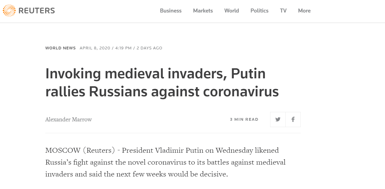 Именно так увидело британское агентство Reuters обращение Путина к населению из-за ситуации с коронавирусом. Агентство пишет, что "Путин сплотил жителей России против коронавируса, вспомнив средневековых захватчиков" XI-XII веков.