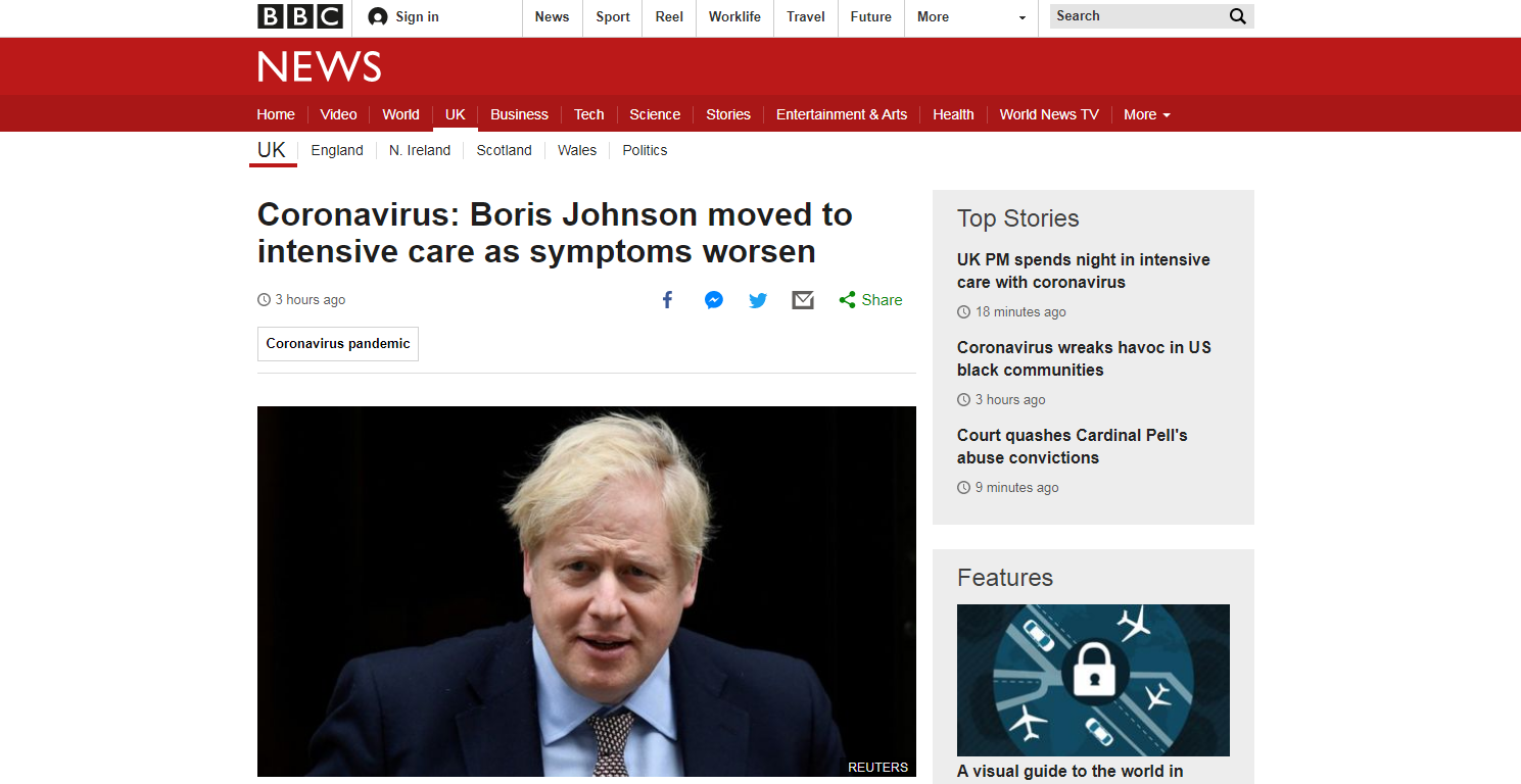 Среди главных коронавирусных новостей 7 апреля — резкое ухудшение состояния премьера Великобритании Бориса Джонсона, который переведён в палату интенсивной терапии, но пока находится в сознании. В США ждут жёсткого сценария пандемии коронавируса в России и уверены, что это станет вызовом для президента Владимира Путина. Московская область начала тестирование системы специальных пропусков.