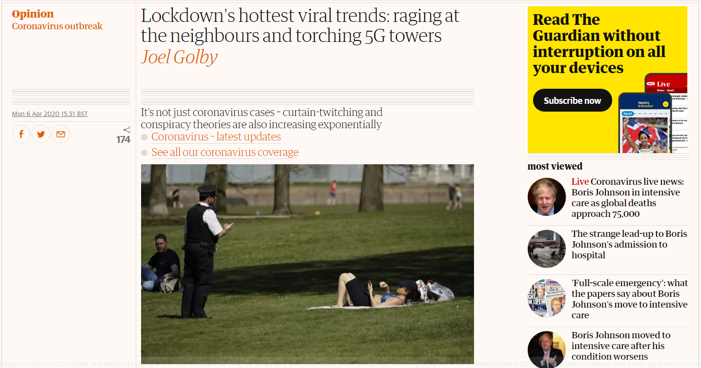 "Существует предположение, что дезинформация о 5G связана с Россией, как и всякая лучшая дезинформация. Об этом говорил Verge в новом отчёте о британской сотовой индустрии. Как предупреждала в прошлом году New York Times, пропагандистские каналы Москвы продвигают теорию о том, что 5G приводит к раку головного мозга, бесплодию, болезни Альцгеймера, аутизму и проблемам с сердцем. Но даже если фейки приходят из России, британцам всё равно нужно разувериться в них раньше, чем в Мерсисайде сгорит башня сотовой связи", — пишет Guardian.