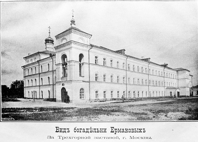 «Домовый храм праведного Филарета Милостивого Ермаковской богадельни за Трехгорной заставой был построен и содержался на средства известного московского благотворителя действительного статского советника Флора Ермакова. Филаретовский храм освящен 24 ноября 1889 года и действовал вплоть до апреля 1922 года, когда был закрыт большевиками. Церковное здание сначала занял детский санаторий, на смену которому пришла детская городская клиническая больница...»