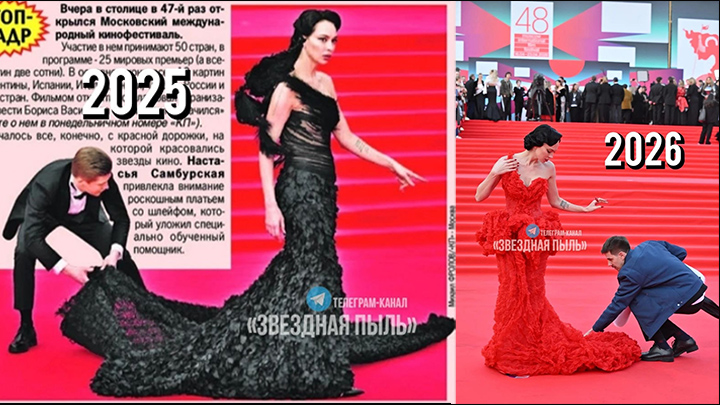 Актриса Настасья Самбурская уже не в первый раз приходит в наряде со шлейфом. Интересная деталь – раньше шлейф ей помогал расправлять помощник в элегантном смокинге, а сейчас – в обычной куртке. Зрители не смогли сдержать иронии на этот счёт.