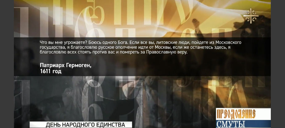 "Совсем недавно открыли памятник Патриарху Гермогену. В текстах времен Смуты он называется Столпом. Тем, кто спас Россию. Тогда не оставалось никого, кроме Церкви, кроме Патриарха, которому поверили. Он разрешил свой народ от присяги Владиславу и легитимизировал восстание, благословил и первое, и второе ополчение".