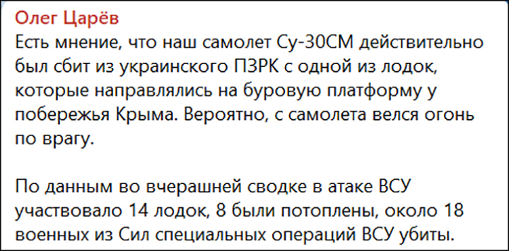 Более того, противник активно делал пуски из ПЗРК по самолётам русских ВКС, работавших по ВСУ из пушек и другого вооружения. И есть информация о том, что один наш Су-30СМ всё же был сбит. По крайней мере, об этом пишет политик Олег Царёв.