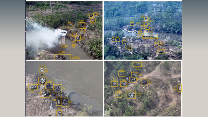 Переправа через Северский Донец: по обеим сторонам реки советская техника, которая в теории должна плавать. Скриншот: ТГ-канал GREY ZONE
