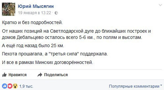 Сейчас не проходит и дня, чтобы украинские СМИ и "патриотические" блогеры не заявляли о все новом продвижении на дебальцевском направлении. Громче всех о "перемогах" кричит некто Юрий Мысягин - волонтёр украинской 54-й бригады, которая занимает позиции на Светлодарской дуге. Так, 19 января 2017 года он сообщил в своем Facebook, что ВСУ в течение года приблизились к Дебальцево аж на целых 20 километров, а также посоветовал "ватникам" и "сепарам" как можно скорее убраться из Дебальцево - "а то ведь можно и не успеть". 24 января Мысягин снова порадовал своих читателей в Facebook новым продвижением на Светлодарской дуге. Правда, некоторые из них тут же посмели усомниться в "перемоге" и указали на то, что ВСУ уже потеряли даже захваченный в ходе декабрьского наступления опорный пункт армии ДНР "Кикимора", на что тот ответил, что "про “Кикимору” писать не пришло время" и "пусть пока машут флагом".