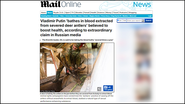 Например, британское издание Daily Mail сообщает, будто секрет завидной бодрости Путина заключается в кровавых купаниях.
