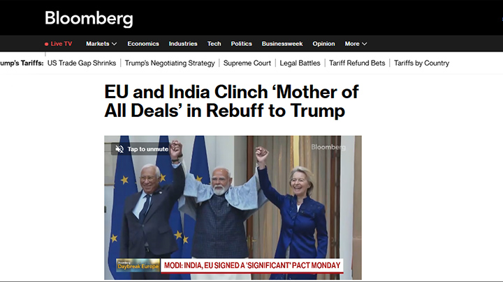 Bloomberg: ЕС и Индия заключают "величайшую сделку" в ответ на действия Трампа. Скриншот: Bloomberg
