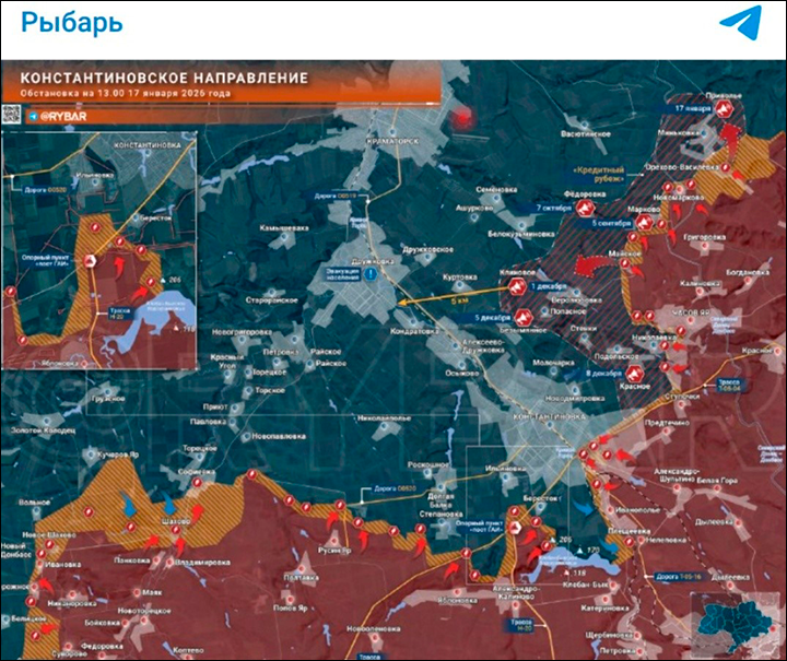 Вот, например, как пишет авторитетный ТГ-канал "Рыбарь", на Константиновском направлении назревает ситуация, "которая может стать проблемой большей, чем Купянск":