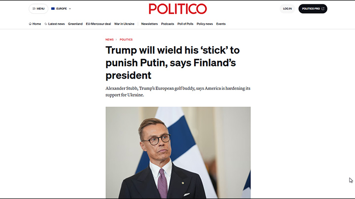 Президент Финляндии заявил, что Трамп перешёл от "политики пряника к большому кнуту" по отношению к России. Скриншот: сайт издания Politico