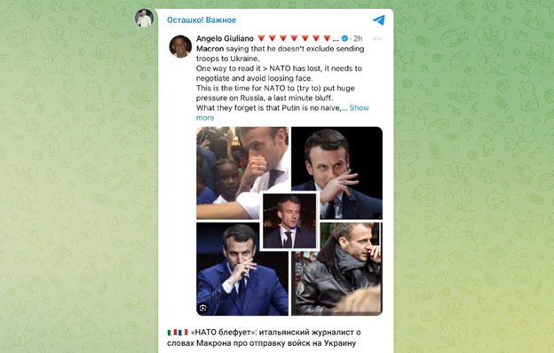 Тонкий намёк на странности в поведении Макрона. У них с Зеленским явно есть что-то общее. Скрин ТГ-канала "Осташко! Важное"