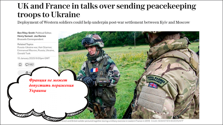 В целом вряд ли в НАТО (и особенно его европейские участники в свете непонятной позиции Трампа по будущему самого альянса) готовы сейчас к прямому столкновению с Россией. Однако вводить войска можно, например, и после какого-то "перемирия". Именно о таком сценарии говорилось и ранее, поэтому Франция демонстрирует свою готовность его осуществить. А в Кремле должны понимать, что в таком случае под защитой контингента НАТО Киев произведёт перевооружение ВСУ. И вскоре Украина будет готова к новой атаке на нашу страну. На этот раз уже с внушительным арсеналом оружия массового поражения.