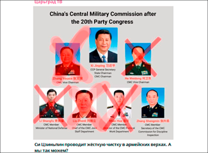На всякий случай, для понимания: только в прошлом году убрали одного за другим сразу девять высокопоставленных военных, включая члена Политбюро ЦК КПК, зампреда ЦВС Хэ Вэйдуна, члена ЦВС, главу управления по политработе Мяо Хуа, его зама Хэ Хунцзюня. А вообще в течение трёх лет после XX съезда КПК в опалу попали более полусотни высокопоставленных военных и оборонных чиновников – начальники сухопутных войск, ВВС, ВМС, ракетных войск стратегического назначения, военизированной полиции, ряда предприятий оборонной промышленности. Был арестован также министр обороны Ли Шанфу.