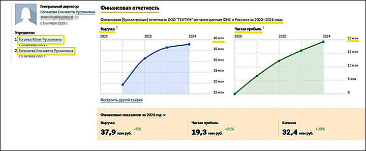 Так, его дочери, Юлия Гогаева и Елизавета Гогичаева, возглавляют ООО "Тектум", работающее на рынке московской недвижимости. Успешный бизнес – с выручкой под 40 млн рублей в год и прибылью под 20 млн рублей. В свою очередь, активы дочерей Цаликова оцениваются в общей сложности в 220 млн рублей (бизнес-центр в Хамовниках и два московских офиса).