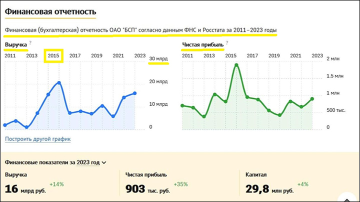 Интересное совпадение – в гору дела (вместе с выручкой) пошли у БСП с 2012 года (Руслан Цаликов стал заместителем министра обороны), а особенно замечательно – в 2015-м (Цаликов – первый зам). Скриншот: интернет-сайт checko.ru
