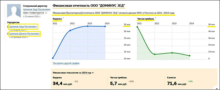 Не отстают и сыновья, Заур Русланович и Даниэл Русланович, которые в качестве руководителей ООО "Доминус" тоже вложились в прибыльный рынок столичной недвижимости. Правда, в последние годы "чистый плюс" у мужской половины бизнеса семьи Цаликовых не такой впечатляющий, на уровне 6-7 млн рублей в год.