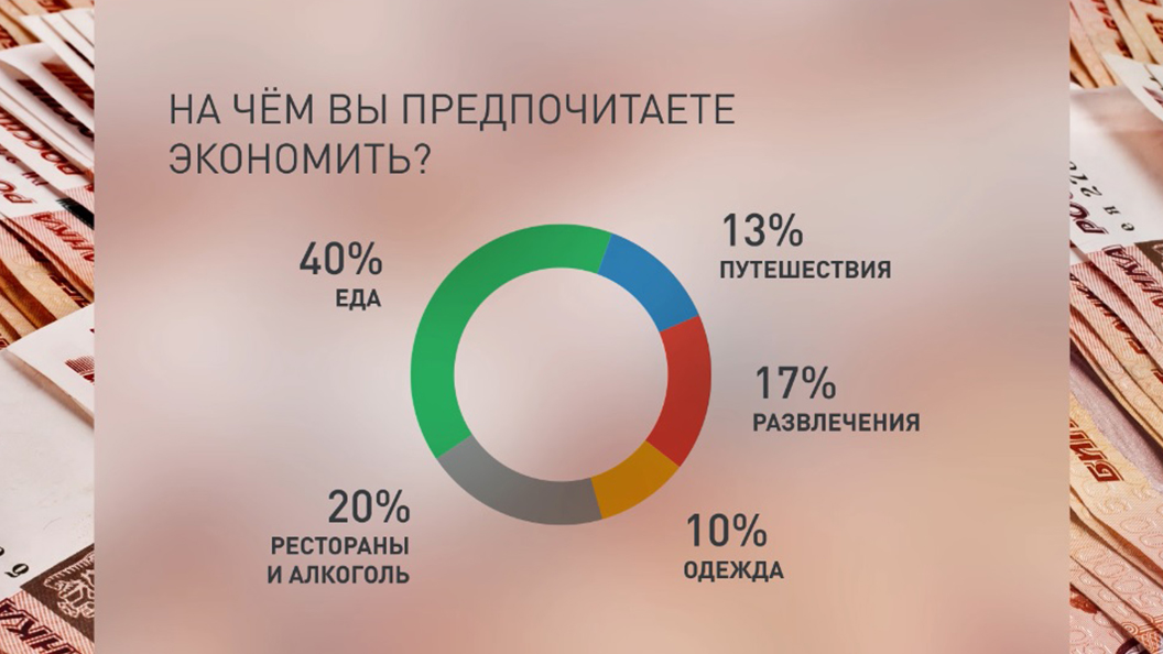 На чём граждане России предпочитают экономить? 40% опрошенных ответили, что на еде, 13% — на путешествиях, 20% — на ресторанах и алкоголе, 10% — на одежде, 17% респондентов — на развлечениях.