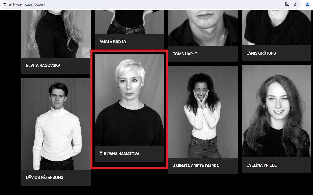 По состоянию на конец июня 2024 года фотография Чулпан Хаматовой присутствует на сайте Нового Рижского театра. Скриншот: интернет-сайт jrt.lv