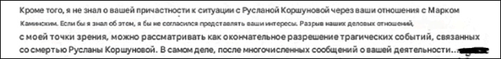 И вот в одном письме Рамси гневно сообщает одной из девушек, судя по всему, что парень Русланы вымогал у него деньги и угрожал ему. И добавляет, что хотел бы перестать "сотрудничать":