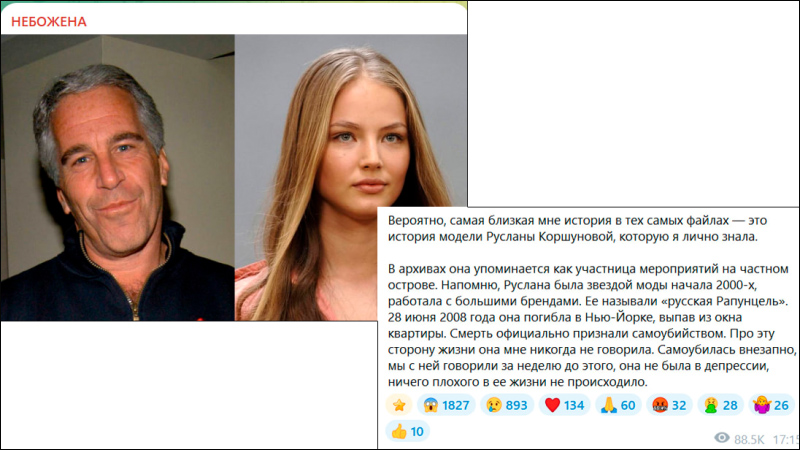 Загадочная смерть красавицы-модели Русланы Коршуновой 17 лет назад в Нью-Йорке могла быть связана с делом миллиардера-педофила Джеффри Эпштейна. В рассекреченных материалах дела Джеффри Эпштейна всплыло имя Коршуновой, и внезапно оказалось, что за официальной версией гибели модели скрывается нечто гораздо более страшное.