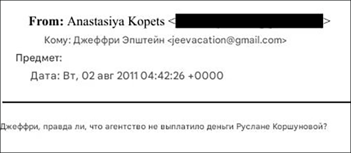 Но по данным обнародованных на сайте Минюста переписок Джеффри Эпштейна, некая Ксения (возможно, та "лучшая подруга" Русланы) поставляла педофилу-финансисту девочек из Казахстана, куда часто летала, а также находила для него развлечения в Нью-Йорке. Она была в достаточно близких отношениях с финансистом, а Эпштейн называл её другом. Спустя два года после трагедии Эпштейн отправил странное сообщение кому-то. Адресат не указан полностью, только буква "К".