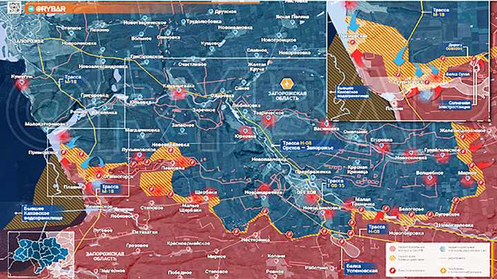 Однако ВСУ также пошли в наступление и к западу от Орехова, стараясь выбить "Днепр" с позиций, занятых в 2025 году. Цель вражеского командования очевидна: отодвинуть наши силы от города Запорожья и разжать тиски, в которые мы зажимаем Орехов, чтобы оставить созданный в нём укрепрайон без снабжения. Но и ликвидация западной клешни нашего охвата радикально усложнит наступление на этот город.