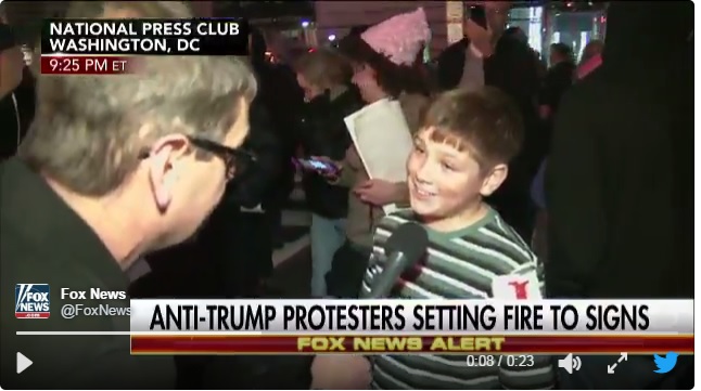 Кстати, протестующие приводят на улицы детей. Этот милый мальчик, например, готов устроить поджог в центре Вашингтона и заявил "Да пошел ты, президент США!" Онижедети!