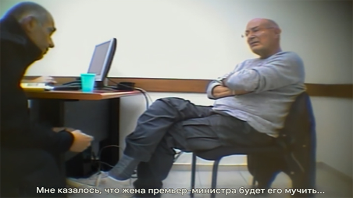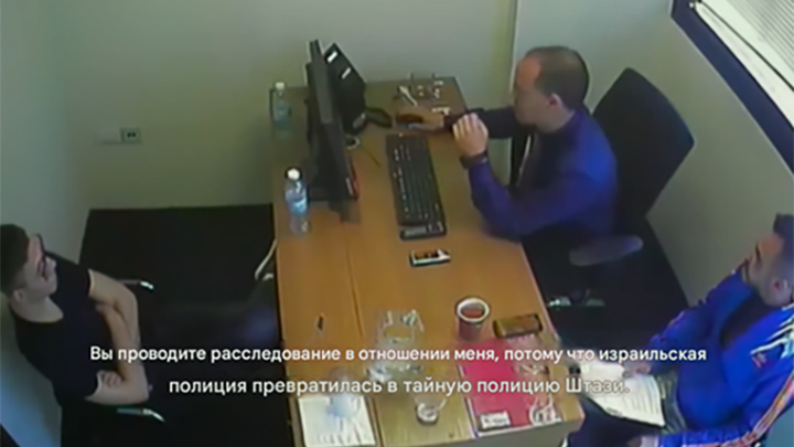 На допросе Яир постоянно прикладывается к бутылке с водой, сидит, развалившись на стуле, и едва ли не орёт на полицейских: