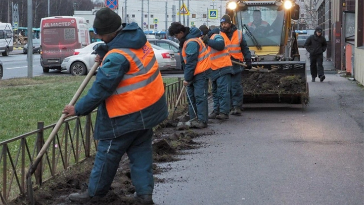 Один из районов Петербурга начали убирать мигранты из Индии. Скриншот видеокадра: ТГ-канал "Фонтанка.ру"
